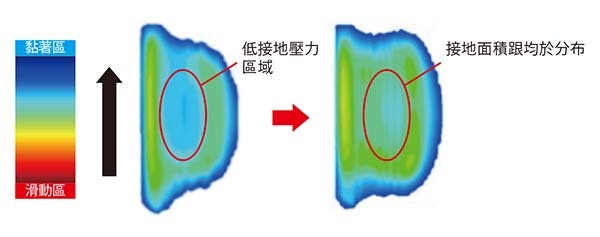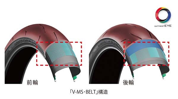 因為採用V-MS・BELT科技使得與地面接觸壓力分佈更均勻,因此底面與輪胎接觸面更加完整進而增強抓地力與性能。