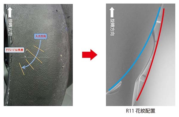 為了提升過彎時的胎面剛性,主要胎紋溝槽設計與在賽道騎乘時輪胎與地面接觸之作用力方向一致。