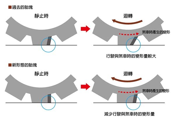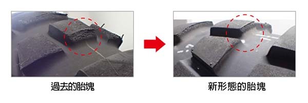 考慮到胎塊使用中會變形,改良前輪胎塊邊緣的設計來減少磨損,有效提升輪胎的耐用性。