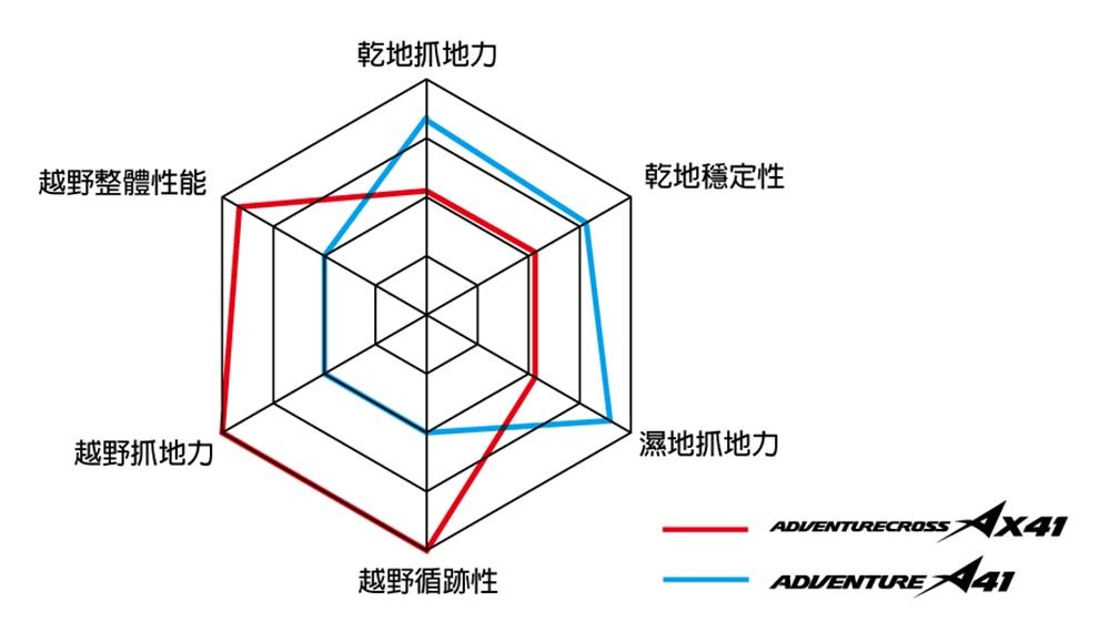 使用了較高面積得側胎塊與較短的胎塊間距(後輪),並且優化胎塊的強度與韌性,在泥濘的路面上有著優異的抓地力以及耐用性。AX41展現了絕佳的越野性能。
